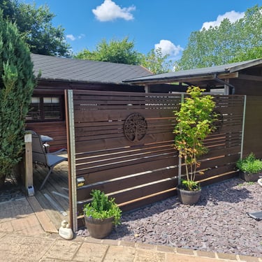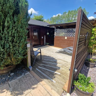 On the decking area directly outside the cabin a patio table and chairs are provided.